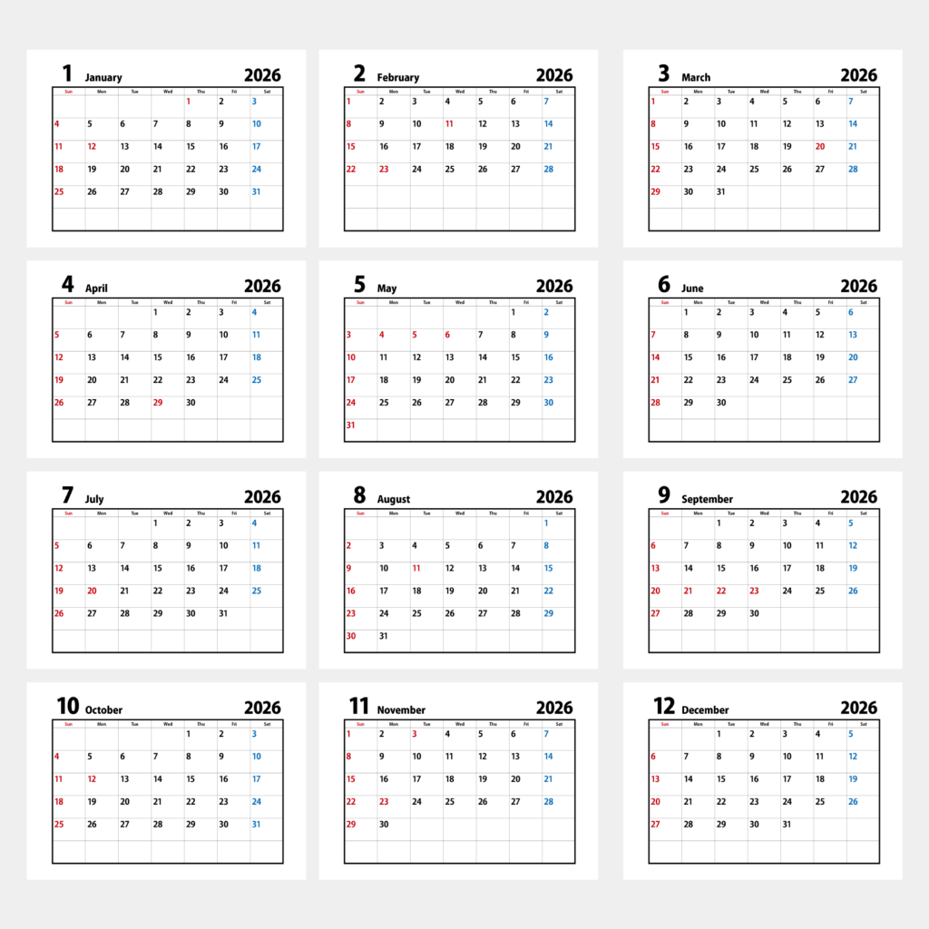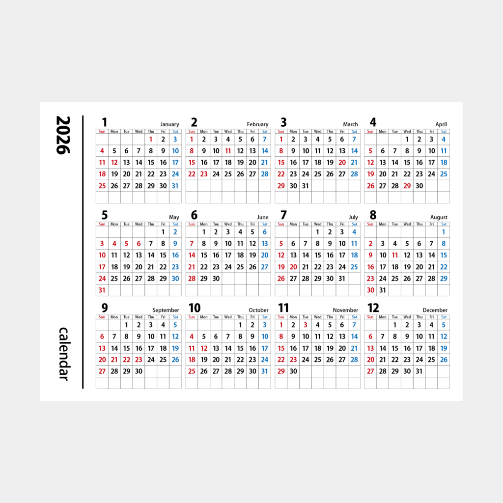 | [無料]始まりは日曜日。2026年シンプルA4横カレンダー(日曜始まり・1枚完結)No.2026-090 |
