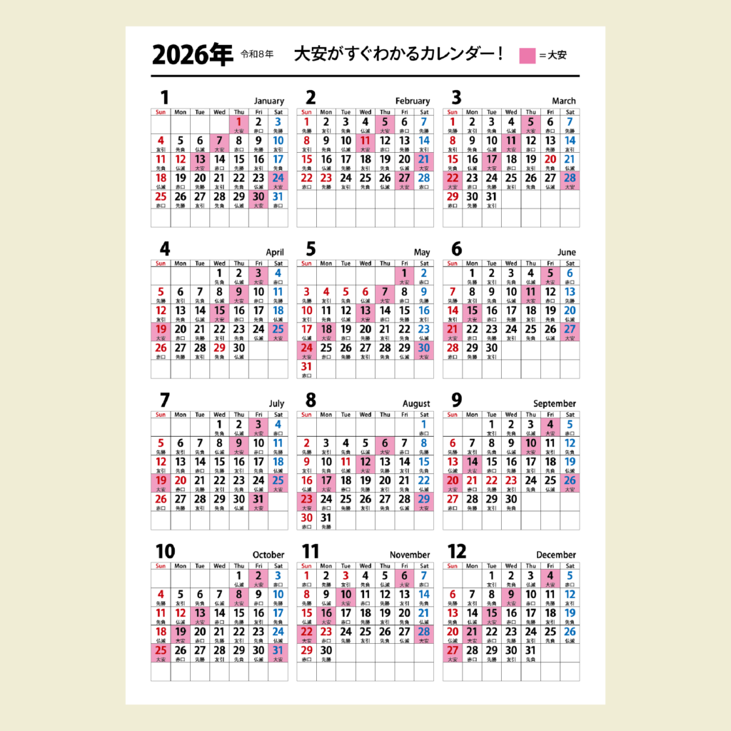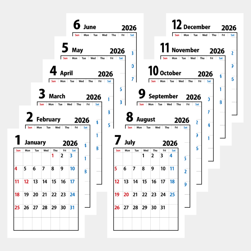 | [無料]始まりは日曜日。2026年シンプルA4縦カレンダー(日曜始まり・1枚完結)No.2026-091 |